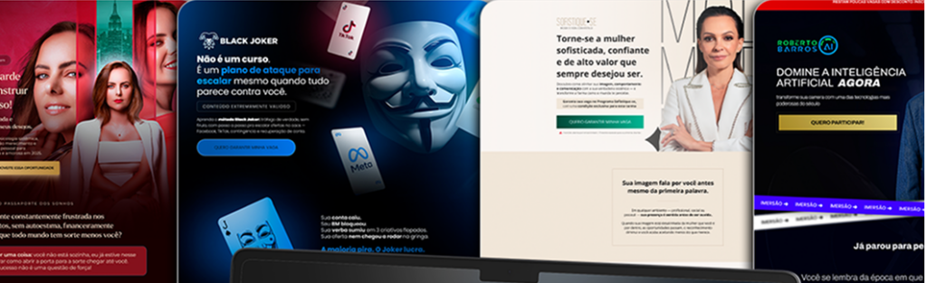 Estruturas visuais focadas em clareza, narrativa e conversão para produtos digitais, treinamentos e serviços.